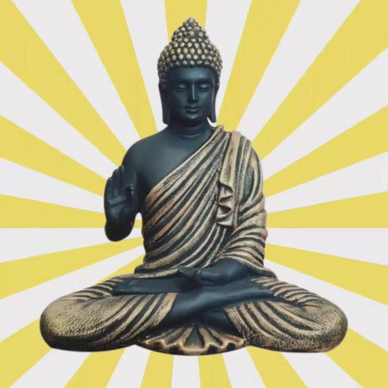 Crafted from high-grade Poly Resin (FRP) and finished with premium PU paint, this stunning Black & Gold Buddha statue exudes serenity and sophistication. Measuring 13 inches in height, it’s the perfect centerpiece for your living room, meditation space, or office.