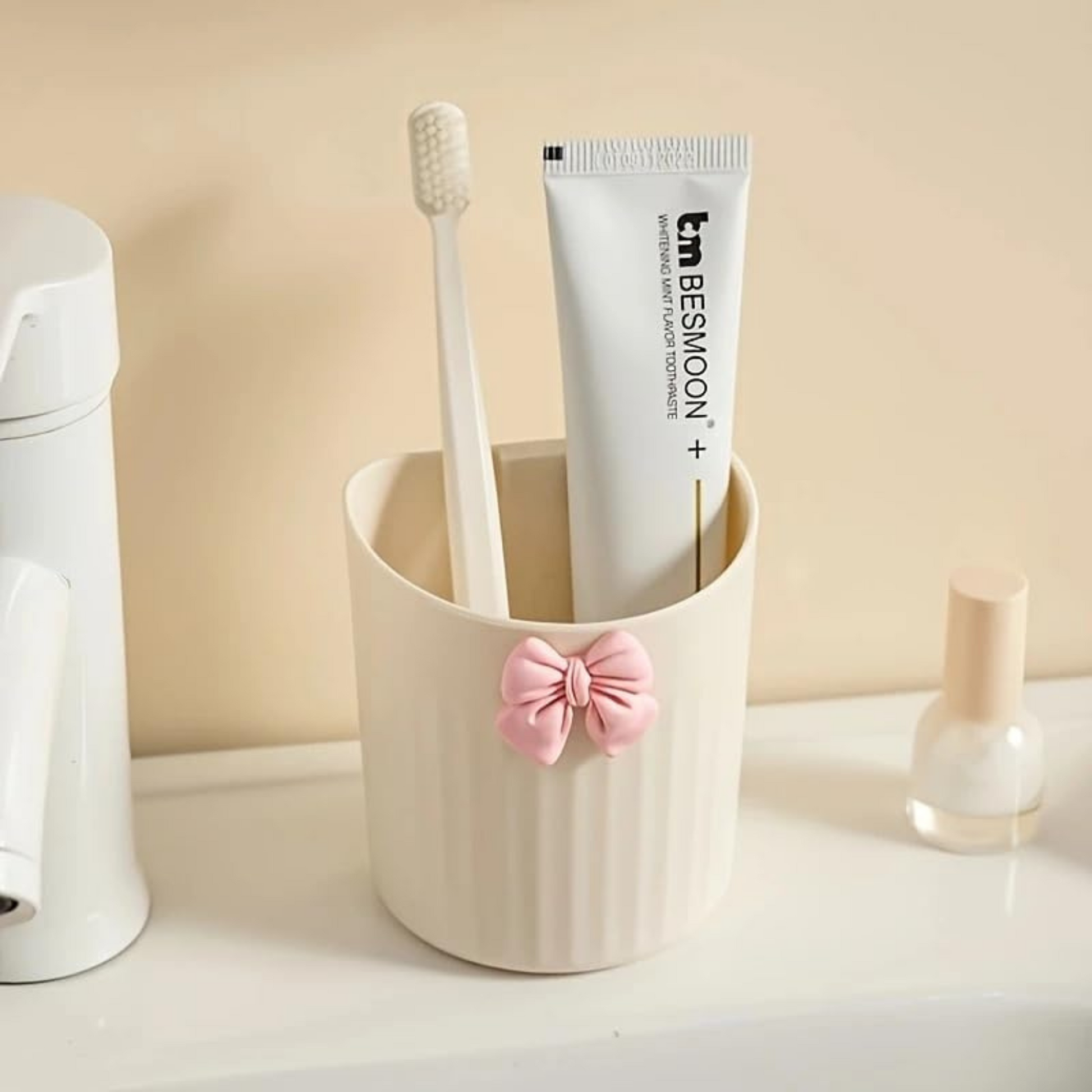 Add charm and functionality to your bathroom with this set of 2 adorable toothbrush and toothpaste holder cups. Featuring a girly pink bow design and made from durable ABS plastic, these cups double as stylish organizers while keeping your sink area tidy.